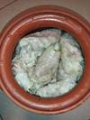 A Cserépedény aljára szórtam átmosott, savanyított káposztát (közé rejettem néhány db füstölt húst), majd a tölteléket egymás mellé és egymásra helyezve tettem az edénybe. Nem kaptam savanyított egész káposzta levelet, így nyers káposztából készítettem a tölteléket. Semmi különbséget nem éreztem, így is nagyon finom lett.